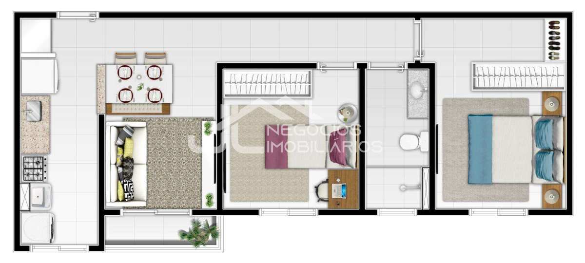 Apartamento com: 2 dormitórios, banheiro social, cozinha, sala 2 ambientes, varanda, 2 vagas de garagem