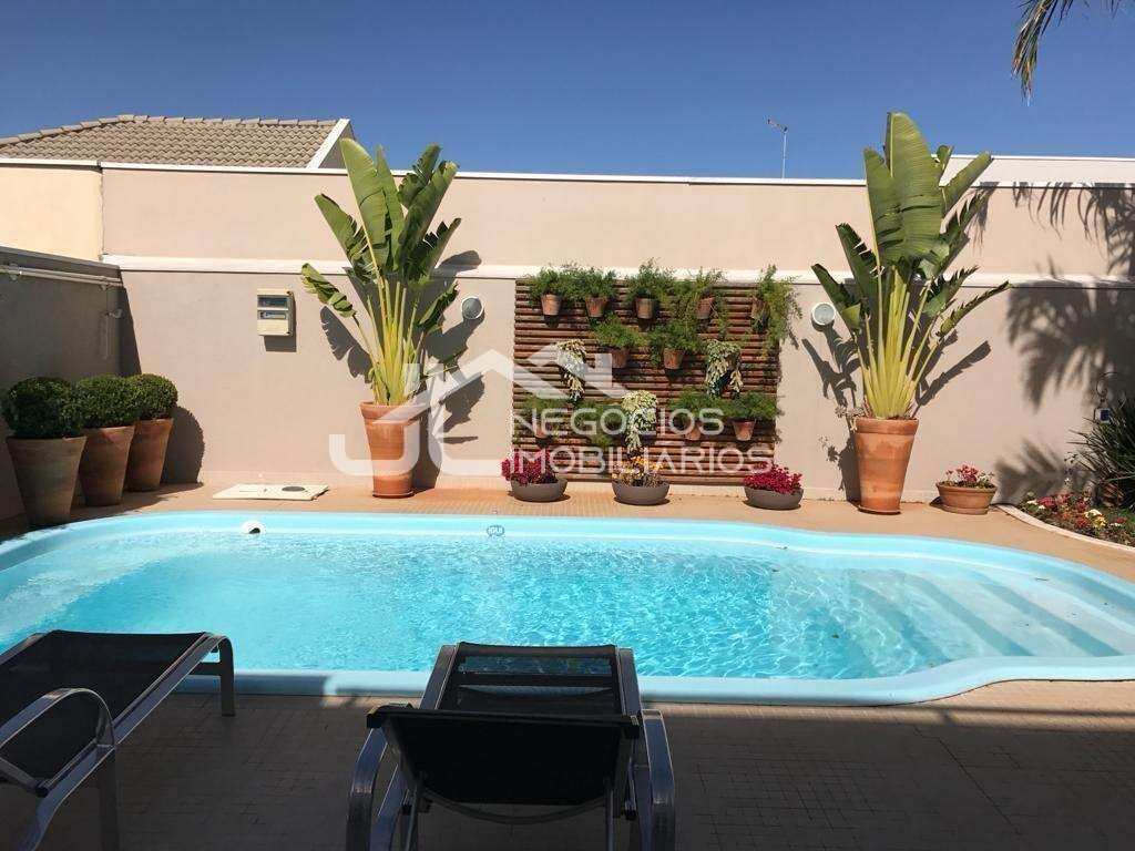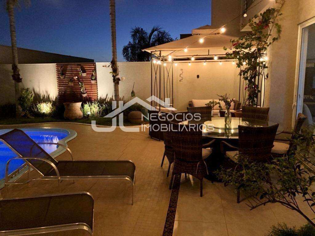 Casa com: sala de estar, sala de jantar, cozinha, 4 dormitórios (todos sendo suíte), área gourmet, piscina