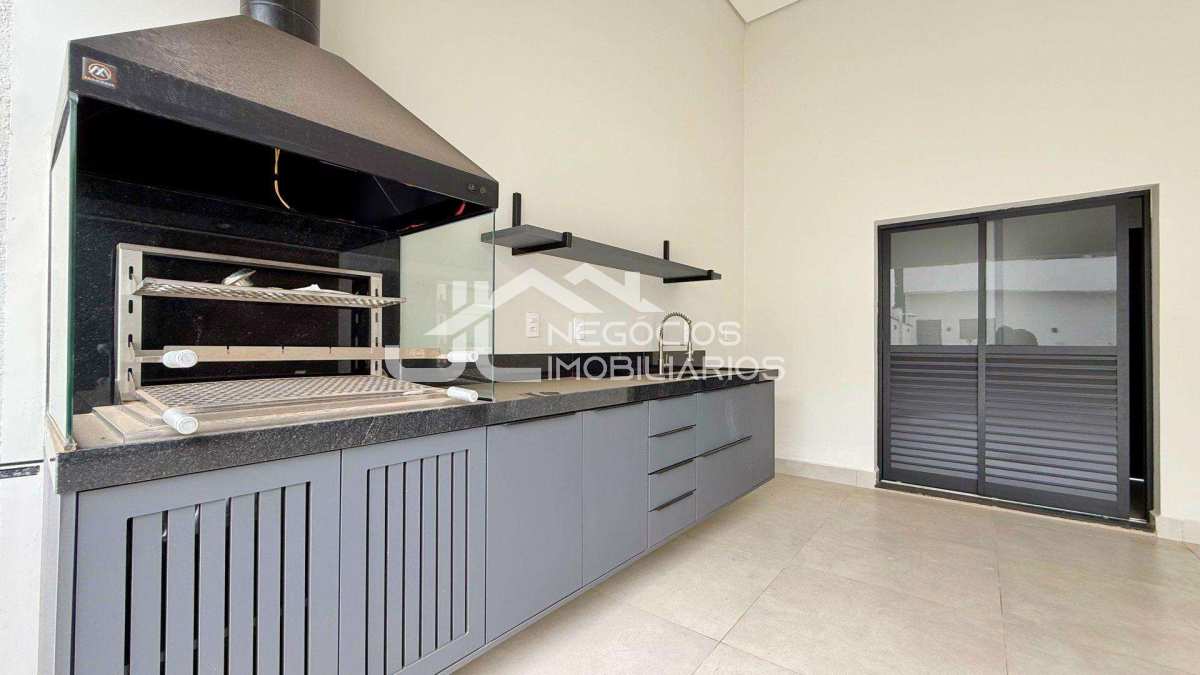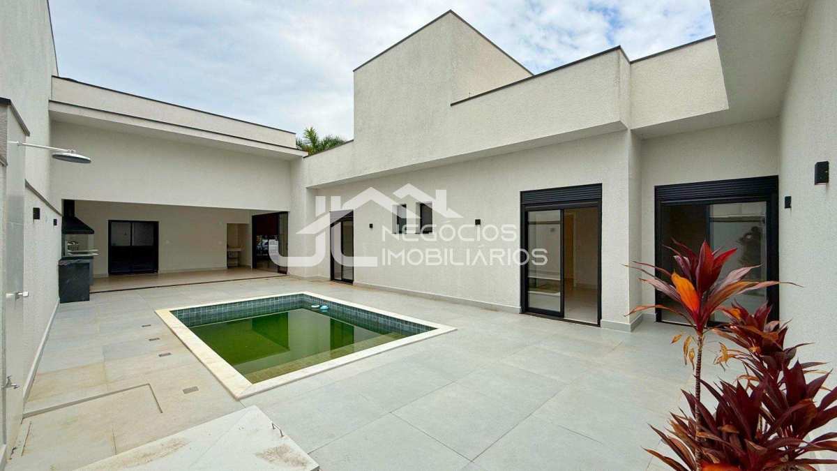 Casa com: sala 2 ambientes, cozinha, 3 suítes, banheiro social, ampla área gourmet, piscina